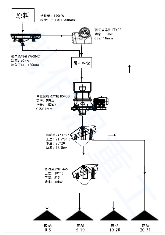 流程圖介紹:原料進---棒條給料機SW0842進---直接進緩沖料倉或顎式破碎機C408進---緩沖料倉進---單缸圓錐破碎機KS430---振動篩2YK1852--單獨的成品20-31mm(返料回緩沖料倉)進---振動篩2YK1445---三種成品0-5mm、5-10mm、10-20mm。